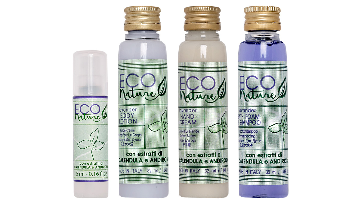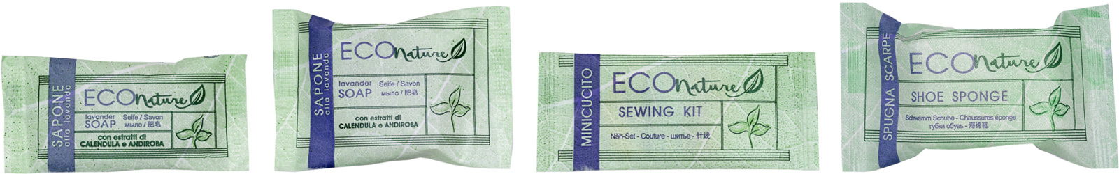 Hermetic flacons 32 ml, made with 100% recycled and recyclable material. Stone powder flow pack printed with eco-friendly inks;